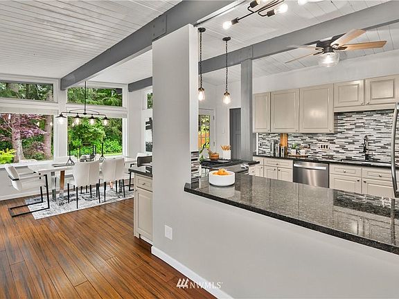 Situated on a peaceful, over half-acre lot, this marvelous mid-century modern three-bedroom home has been updated throughout! Youll love the quintessential mid-century design elements like the exposed beams and clerestory windows. Remodeled entertainer's kitchen, modern bathrooms, newer flooring and fresh paint. Relax in the great room with a wood-burning fireplace. Open kitchen with stone counters and stainless steel appliances. Unwind in the master retreat with French doors out to the patio. There is also a home office/flex space. Air conditioning in the main living area to keep you cool. Gorgeous, large, flat backyard with gazebo, shed, and mature evergreens. Highly sought-after Issaquah Schools. This is the one.