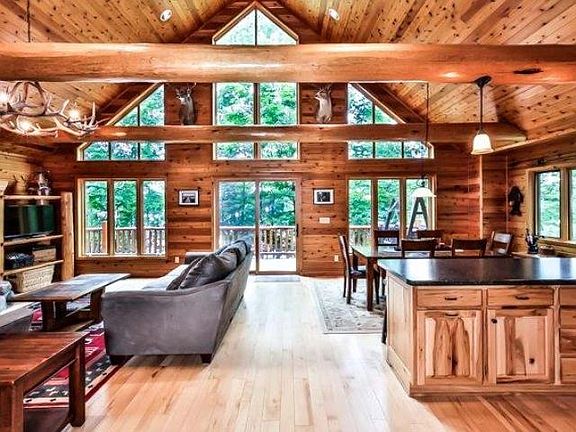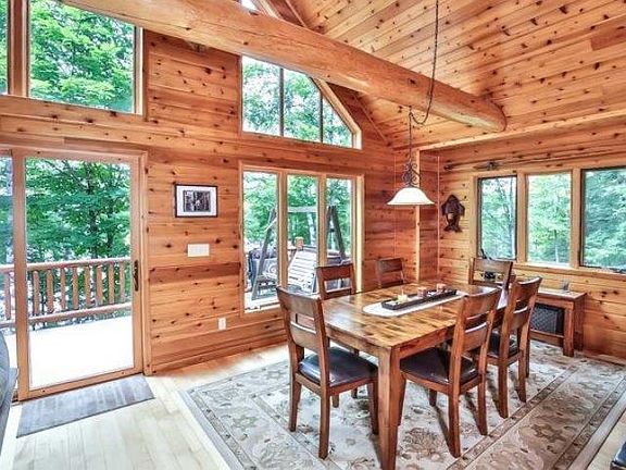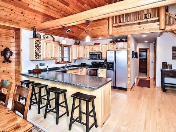 Architecturally designed "Jim Meier" build. This home features a covered porch entry and open concept floor plan. The great room and sunroom are anchored with a floor-to-ceiling, two-way wood burning "Benson" fireplace with hand selected full fieldstone boulders. The fireplace and custom antler chandelier create a focal point for both rooms. Spacious kitchen w/Hickory cabinetry. Maple flooring, Knotty Pine T & G, log beams and railings accent the great room area. Main floor master suite, upper level has 2 bedrooms and bath. Six panel solid doors and large Kolbe windows throughout. 2 1/2+ car gar/workshop. Enjoy evening sunsets from the wrap-around deck or morning coffee on the covered porch. Serenity surrounds you on this private parcel w/extensive landscaping, swim frontage, fire-pit and sunset views. Great fishing on this 500 acre, 57' deep lake. Near paved bike trails, groomed snowmobile trails and fine restaurants. The ultimate family retreat!