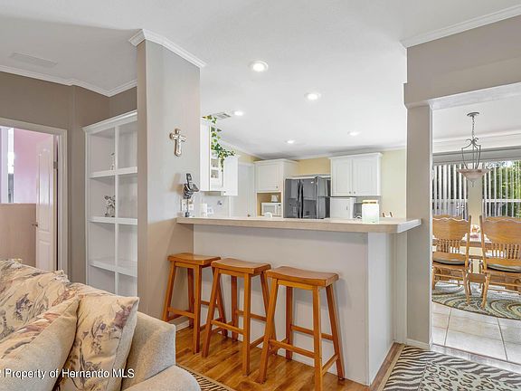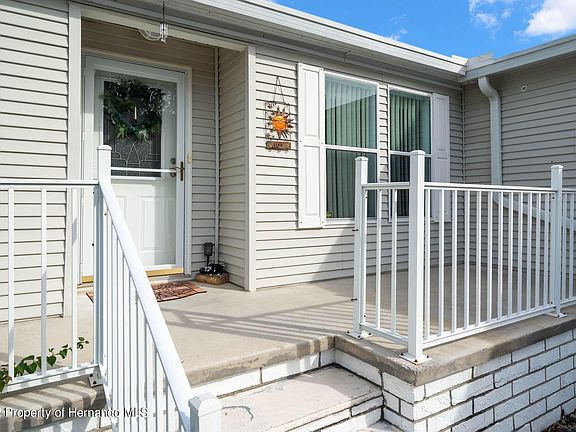 2004 built 3 BEDROOM 2 CAR GARAGE home being sold COMPLETELY FURNISHED located in the 55 plus GOLF COURSE COMMUNITY OF Brookridge where you own your own land. Brookridge is a masterfully planned 55+ manufactured home community located on Florida's nature coast, in the Hernando County town of Brooksville. This secure (24/7 gated access) Florida golf community features an 18-hole, par-72 golf course winding throughout the landscape. Brookridge is a deed-restricted community with all lots individually owned. All owners belong to the Brookridge Community Home Owners Association where fees are kept to a consistently low level (currently $48 monthly for this lot). Community features include golf course, community pool, guard gate and more. This home has it all starting with an adorable porch by the front door perfect for relaxing in the evenings. When you enter, you will be amazed by the high ceilings and open floor plan. The kitchen features white cabinets, a kitchen island and a breakfast bar along with a large dining area. The family room is completely open to the kitchen and features a cathedral ceiling and sliders that open to the enclosed patio. The entire home except wet areas has newer vinyl plank flooring and the walls are drywall with texture finish. The first of the two guest bedrooms is being used as a home office and has a built in desk. The second guest bedroom is located towards the rear of the home right off of the guest bathroom giving your guest privacy. The master bedroom suite is spacious and includes a private bathroom with double sink and walk-in shower plus a HUGE walk-in closet. The backyard is completely fenced with privacy fence and includes an open brick paver patio where the current owner has spent many nights entertaining friends and neighbors. All of this plus a 2 car garage, inside laundry room AND a new roof in 2022.