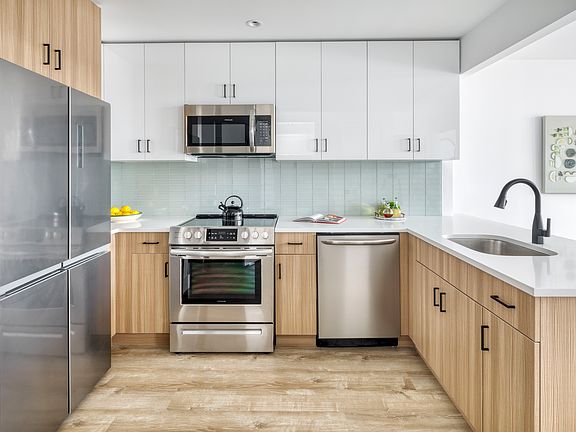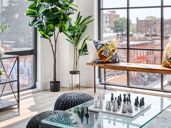 HUGE PRIVATE TERRACE WITH VIEWS. NO BROKERS FEE. 1425 Fulton is a luxury boutique rental building in the heart of Bed-Stuy. Every unit has custom finishes and open living plans. Floor-to-ceiling casement windows bathe these modern homes in light. Wide-plank floors and thoughtfully outfitted kitchens and baths create a comfortable and stylish home-base. In unit washer/dryers, eat in kitchen islands, HVAC control for each room, a live in super, and amenities make this a place for easy, private, and elevated living for just 26 units. 9B is a spacious 2 bedroom 1 bathroom home with high ceilings, floor to ceiling windows, and abundant light. It has a HUGE PRIVATE TERRACE with open views conveniently accessed right off the living room. No stepping through bedrooms to get outside. The gourmet kitchen is beautifully outfitted with white lacquer cabinetry, complemented by glass tile backsplashes, Caesarstone countertop, a full stainless-steel appliance package, and a built in island. There is also plenty of storage. The bedrooms both have incredible views of the Manhattan skyline. This amenity filled property boasts a resident lounge, fitness center, pet spa and a welcoming roof deck with a grill and views. Positioned in one of Brooklyn's most sought-after historical neighborhoods, Bedford-Stuyvesant is at the cross section of culture and art with its eclectic mix of brownstones, restaurants and boutiques. 1425 Fulton is located on bustling Fulton Street where you have everything you need from health food stores, supermarkets to coffee shops, and an array of amazing cuisine, all within close proximity to the A and C trains. Manhattan is only 20 minutes away.