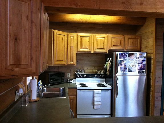 This is a one-bedroom A-frame log cabin built in 1987 and remodeled with new kitchen cabinets, kitchen appliances, carpeting on both levels (main floor and large loft), and large deck.