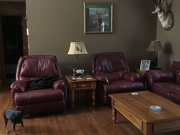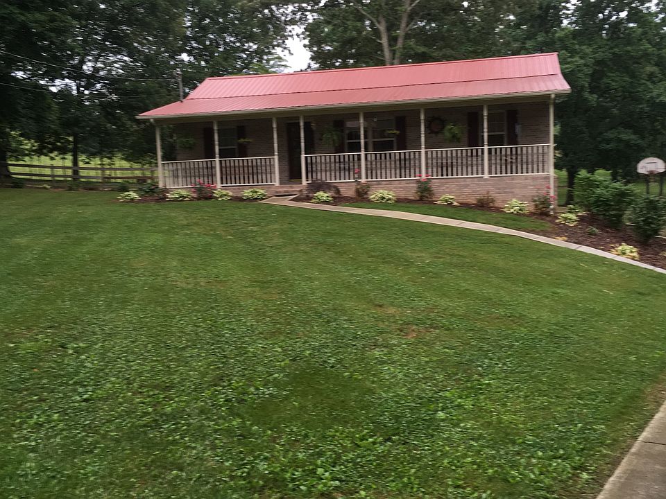 Nice home on 1.40 acres. Full brick Rancher with country front porch. Split bedroom design. Hardwood, tile and carpet. Partially finished basement with 2 car garage. New metal roof. Storage barn with power included. Nice, private setting. Sq. frontage approximately in basement.