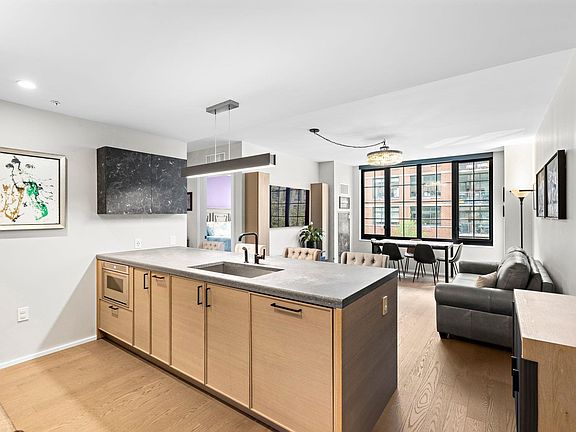 Residence 2E at 1425 Hudson Street offers 836 square feet of thoughtfully designed living space with an open-concept layout. Oversized windows fill the home with natural light, highlighting wide-plank hardwood floors and modern finishes throughout. The kitchen features custom cabinetry, wine fridge, quartz countertops, and a Thermador appliance suite with a paneled refrigerator, five-burner gas cooktop, and built-in microwave. The spacious bedroom includes a walk-in closet, and the bathroom is finished with honed limestone floors, Kohler fixtures, and quartz counters. A full-size Whirlpool washer and dryer and Nest thermostat complete the home. Residents enjoy a 24-hour attended lobby, rooftop pool and terrace with Manhattan skyline views, a fitness center, residents' lounge, children's playroom, and garage parking available for an additional fee. Ideally located near Hoboken's waterfront parks, Urban Market, Trader Joe's, Whole Foods, and the 14th Street Ferry.