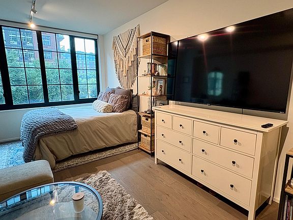 Discover urban luxury living at its finest in this stunning west-facing studio located in one of Hoboken's most desirable waterfront buildings. This unit features a spacious open-concept layout with a living room and bedroom area large enough for a queen bed separate from the kitchen. Expansive windows flood the apartment with beautiful natural light. The chef's kitchen is equipped with a full-size Thermador oven/range, microwave and cabinet panelled refrigerator and dishwasher, sleek countertops and generous cabinetry. The modern bathroom features a glass enclosed bath and gorgeous tiles. A large stackable Whirlpool washer/dryer makes laundry a breeze. Not one, but TWO custom-designed walk-in closets provide ample storage. Gleaming hardwood floors, custom electric blackout shades, Nest thermostat and garbage disposal complete this amazing home. Luxury boutique building features a rooftop pool overlooking the Hudson River and Manhattan skyline, outdoor grills and TV, fully-equipped gym, playroom and convenient shuttle to the PATH for easy commuting. Surrounded by some of Hoboken's finest restaurants, coffee shops, grocery stores and parks, and just 2 blocks to the Ferry and #126 bus stop. Parking available for rent nearby. This one truly has it all!
