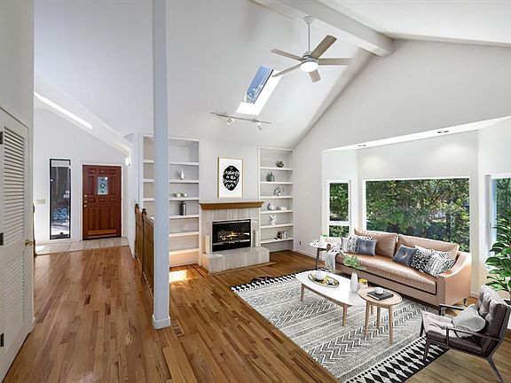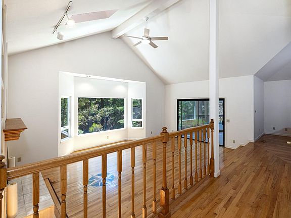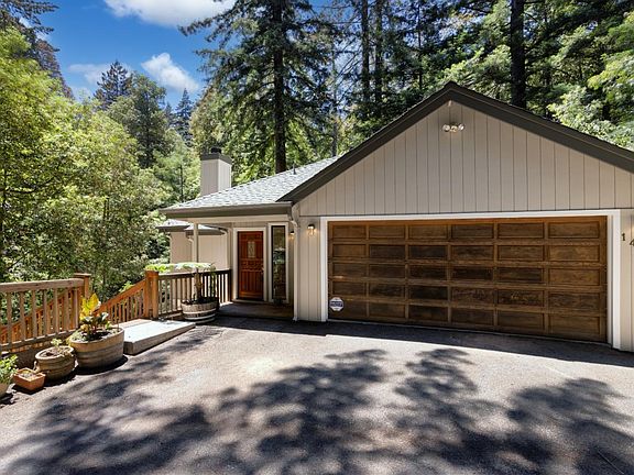 A coveted, serene, sunny setting walking distance to Bonny Doon Elementary. Step down into the warm living area with high ceilings, attractive custom inlaid hardwood, and built-in bookshelves surrounding the fireplace. Updated top of the line kitchen with a cozy eating area, an island with bar seating, a walk in pantry, as well as a substantial dining area. There is a large deck off of the dining room, perfect for indoor outdoor living, whether enjoying morning coffee, family barbecues, and bird watching. Large windows and skylights bring in an abundance of light, as well as provide unparalleled forested treehouse views. Moving downstairs, the oversized main bedroom features a walk-in closet, large en suite bath, as well as a separate office area. 2 more generous bedrooms and a full bath round out the lower level. The property has multiple outdoor decks, garden beds, its own redwood grove, beautiful azalea's, creek access and plenty of space for play, exploration and cultivation.