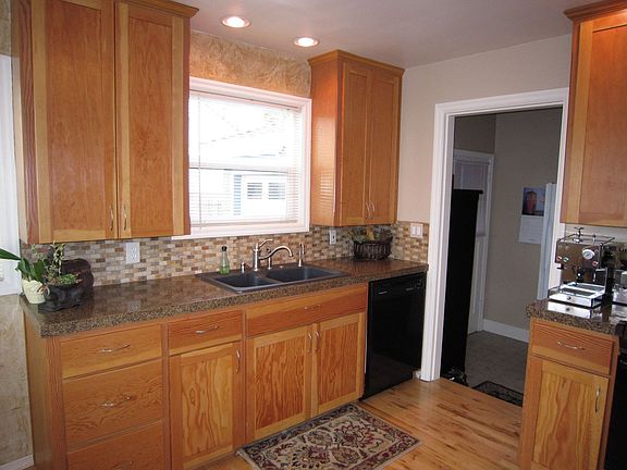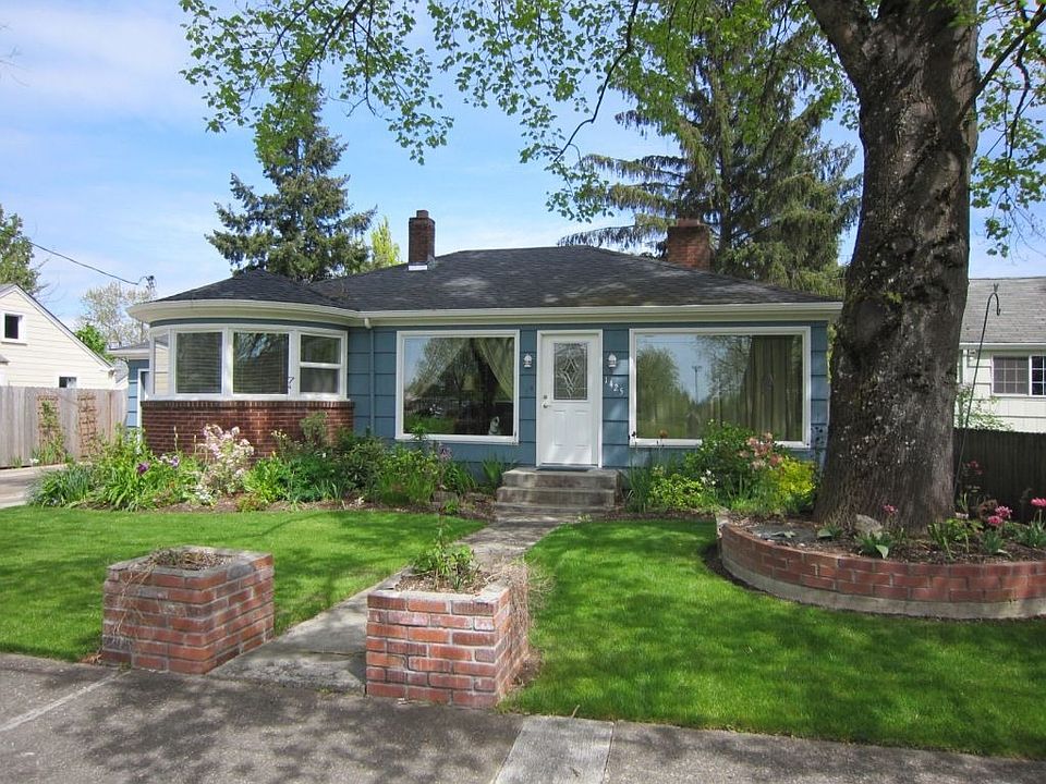 Darling home with maple floors throughout,coved ceilings,FA gas heat plus a/c,fireplace plumbed for gas. Remodeled kitchen with granite counters and updated appliances.Nice size bedrooms, one w/double closets and yard access. Lovely, fenced yard with garden beds, sprinklers, fruit tree, water feature, patio and tool shed. Extra deep one car garage. Very charming bungalow conveniently located to downtown,UO,shopping and bus.