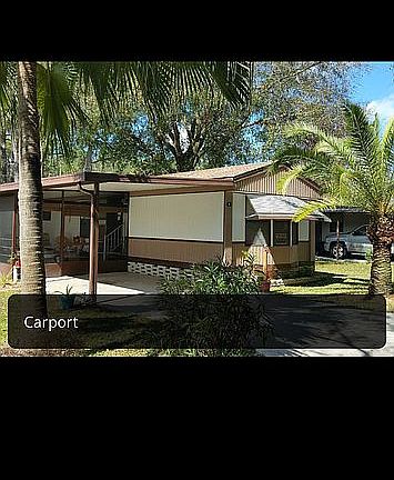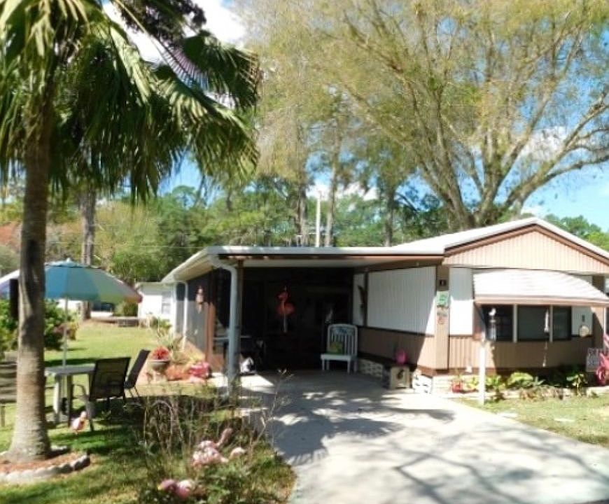 2 bed 2 bath with view of pond out back. Brand New 2023 AC unit installed. Yard has pineapple plants and other beautiful bushes and flowers. Extra large screened in porch with privacy blinds. New hot tub overlooking pond, only used a few times. Storage shed and covered carport. Double layer metal roof, newer hot water tank and ice cold AC. Home is solid and had absolutely no damage or issues with previous hurricane. 55+ community, quiet, small and quaint. 2 dogs maximum (large dogs welcome). One of the few parks around in Florida that allow pets over 25 pounds. All applicants must have a criminal background check and credit check. Park manager will accept applications for interested buyers. NO POOL here in the community, but you have your own personal hot tub perfect for watching sunsets in your private oasis!