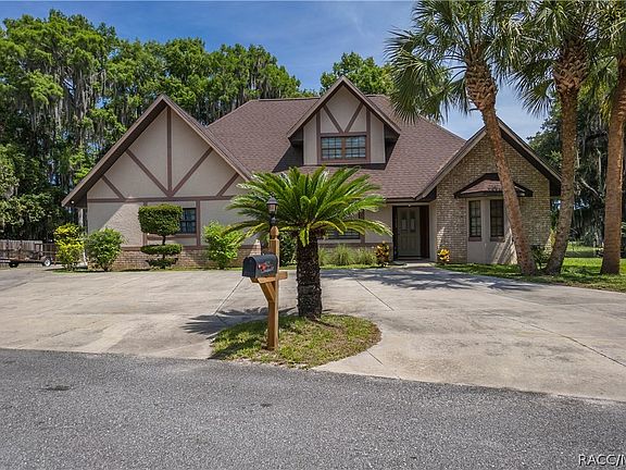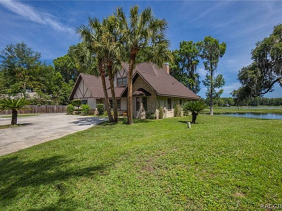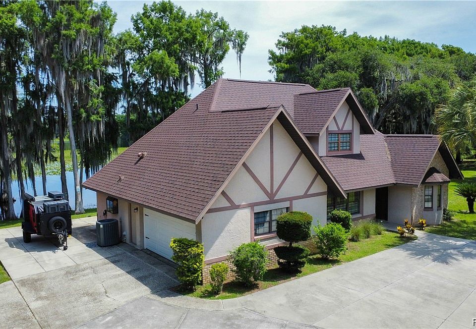 WIDE OPEN LAKEFRONT on Big Lake Henderson. This impeccable deal will be sure to have you asking "where do I sign?!" Expansive open water views from almost every angle of the property. Deep water right off your shoreline. This Tudor style home is meticulously maintained, easily checking all the boxes on your list of wants and needs. This home offers many thoughtful updates throughout including, ceiling fans and light fixtures, custom fit blinds in all the windows, a water filter system, and recently a new garage door was installed this year. The roof, A/C, solar fans in attic, and sliding glass doors were all updated in 2014. Also a large concrete circle driveway and additional parking area just beside the garage was added in 2014. This gives you plenty of room for parking your all of your toys. The exterior grounds shows off a multitude of mature native Florida palm trees, sago palms, water oaks, and cypress trees along the shoreline. Decorative shrubbery is tastefully placed around the exterior of the home. Take a step inside and you are sure to fall in love with the idea of life on the lake. The Main living area is split between a ground floor boasting a Kitchen with large bay windows, a breakfast nook and bar, expansive living area with LVP flooring and a wood burning stone fireplace. The guest quarters are downstairs as well complete with two bedrooms and an updated bathroom. Make your way up to the second floor to the extra large Master Suite complete with a walk in closet with custom built in shelving, a full bathroom with a generously sized vanity plus powder station. From the master suite, walk out the sliding glass doors onto the over sized balcony offering breathtaking views of the open lake. Head out back to the screened in 12' x 20' porch area, and a 12' x 24' concrete patio. All of this is over looking the one of the best views on all of Lake Henderson. This is your opportunity to own a truly one of a kind property in one of the most sought after locations on all of the Tsala Apopka chain of lakes.