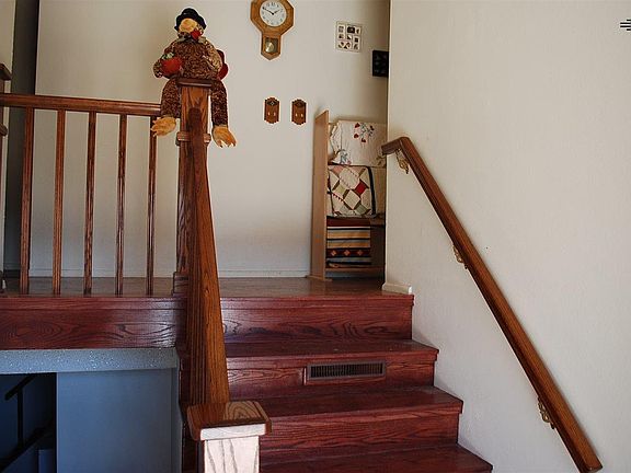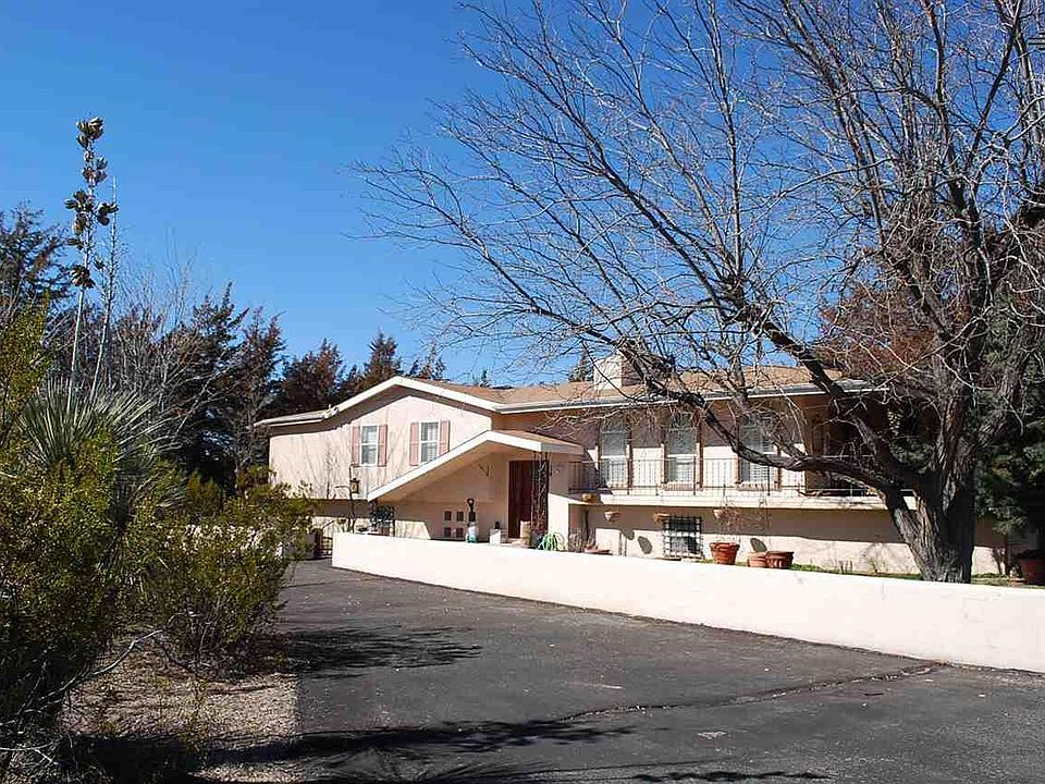 2820 SF home on 10 acres. 4 or 5 bedroom. 3 bath. Split level. 2 master bedrooms plus a small bedroom upstairs as well as the living area. Nice balcony off the living and dining rooms. Nice kitchen and appliances. Down stairs there are 2 bedrooms, a bath and a large game room, laundry room and 2 single car garages. Large storage room outside and well as several fenced areas for gardens etc. Lot of trees. Amazing mountain views all around. Paved circular driveway. Fenced.