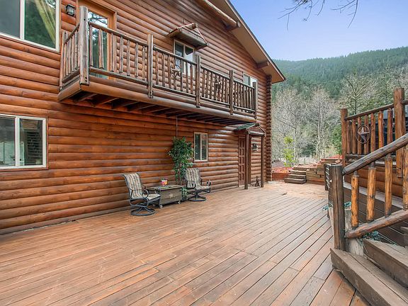 MOUNTAIN RETREAT! Located above a forested valley just east of Pikes Peak, this wonderful custom log home is loaded with mountain charm! Guests will simply adore the serenity of the front deck and the expanse of the flowing open floor plan, once inside! Overlooking the large dining area, the fabulous kitchen loaded with custom cabinets, stainless appliances and granite counters will be the hub for entertaining family and friends! Venture out on the east deck and everyone will be amazed at distant Colorado Springs views, as they listen to the splash of the creek, down below! Four bedrooms and bath located upstairs are highlighted with a large master bedroom loaded with extensive custom woodwork and walk-in closet! Your balcony will be perfect for morning coffee or evening stargazing and the lower level offers bedroom and bathroom that could easily be a secondary living area or fitness room! Gated community, clubhouse, heated pool, tennis, playground and miles of hiking & biking trails!