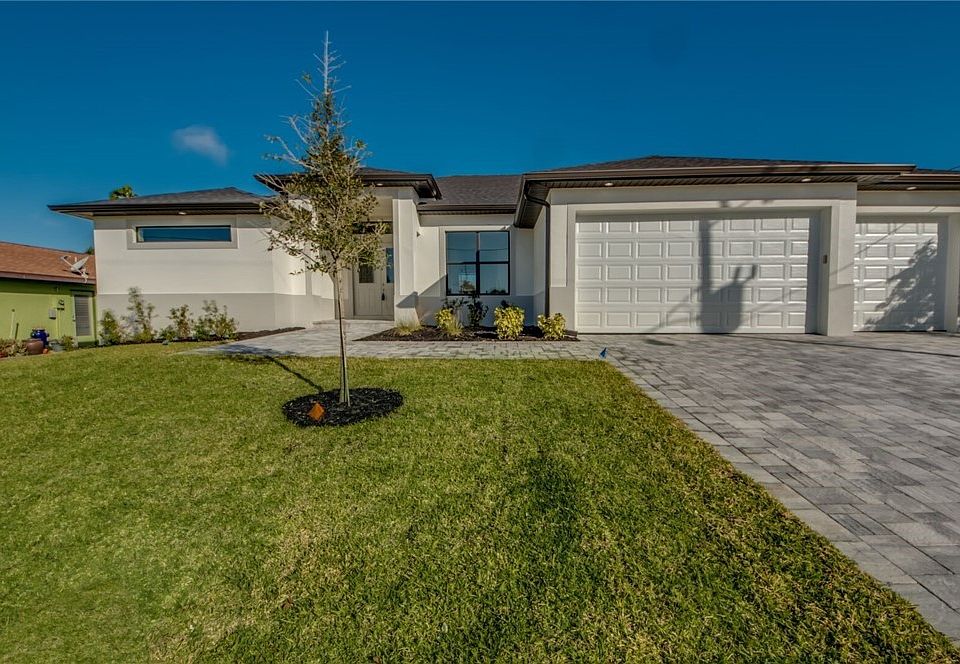 Looking for quick out waterfront without over spending? Gorgeous new construction WATERFRONT in the Cape Coral Yacht club area. Only one bridge to the river. Ready to move in too. Minutes to open water by boat. Walk to bars, restaurants, famers market, art fairs. Home boasts 3 bedrooms PLUS den. Open concept living and kitchen area with GRANITE countertops. SS appliances. Laundry room with W/D hook ups. 3 car garage and the 3rd single garage is deeper for a work room or storage. Home has high ceilings with beautiful views to the water. Come take a look, you won't be disappointed.