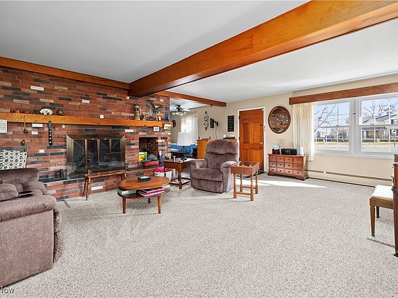 plenty of cabinets. The living room has a wood beamed ceiling and fireplace. The family