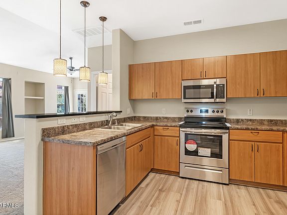 LOCATION! LOCATION! LOCATION! This cozy home features a spacious living room with plenty of natural sunlight and a built in desk for your home office/workspace needs. The kitchen boasts newer appliances (& a breakfast bar w/ granite countertop.) Enjoy the convenience of the in unit laundry & the private patio off the living room. Take advantage of the community pool & heated spa, fitness center, and clubhouse with access to a chef's kitchen. Enjoy the convenience of a flat rate water bill and sewer/trash fees that are included in your monthly HOA fee. This home is just minutes from Litchfield City Center, the Wigwam Resort, Downtown Litchfield Park, tons of shopping and dining, & only 2.8 miles from Luke Air Force Base. This gem is a MUST SEE!!!