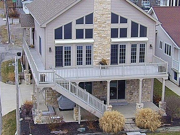Absolutely beautiful, 3 bedroom, 2.5 bath waterfront home with amazing open water views! Very open floor plan with hardwood flooring, cathedral ceilings, ceiling fans, and more! New central air in 2016!! Huge master bedroom w/large master bath and great walk-in closet. Outside features include awesome wrap-around composite deck w/vinyl railings for very low maintenance, covered dock w/lift, and firepit area. Professionally landscaped. Great storage area (29x20) on lower level, perfect for storage, game room, and more (includes half bath). Parking on property for five vehicles; two additional on easement.