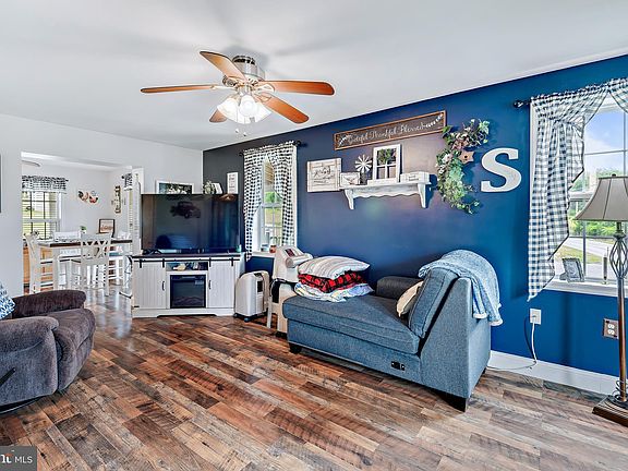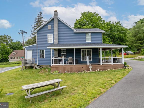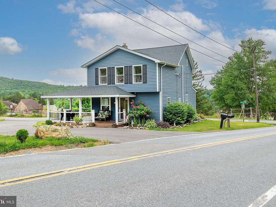 Renovated 3 bedroom, 2 bath single family home with wrap-around porch on a 1 acre corner lot. Main level features a country kitchen with breakfast area, living room, office/study, and full bathroom with laminate wood flooring throughout. Chimney for potential wood or pellet stove in living room. Upper floor has a large 22x14 owner's suite addition with two closets. Laundry in basement. Property has been updated with new roof, all new vinyl siding, new insulation and drywall, 4 mini-split systems for heating and cooling, and asphalt driveway. Above ground pool. Over-sized 24x56 garage large enough for 6 or more vehicles, has oil furnace, and car lift conveys. 14x17 garden shed and small pond.