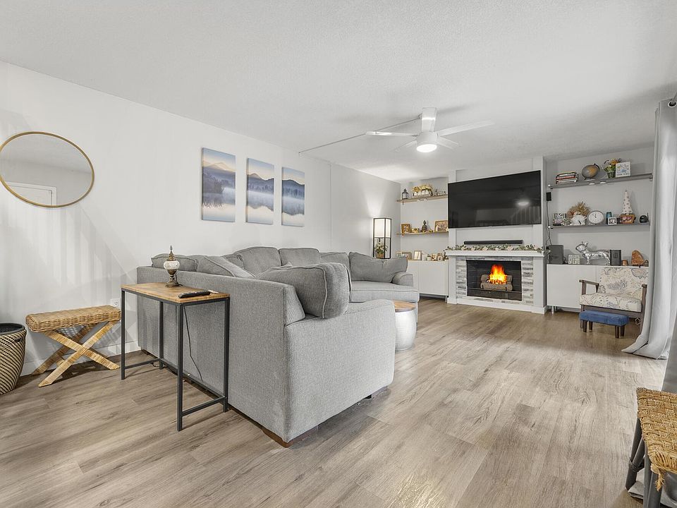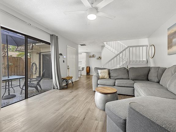 This stunning 2-bedroom, 2.5-bath home has been beautifully renovated in 2021. The cozy living room features a custom built entertainment center and a fireplace, perfect for relaxation. Enjoy the new waterproof laminate flooring throughout, leading to a bright kitchen equipped with quartz countertops and new stainless steel appliances, complemented by a touch less faucet, modern hardware, and elegant light fixtures. The guest bathroom downstairs offers an updated vanity and a stylish barn door that conceals the washer/dryer for added convenience. Upstairs, you'll find a spacious primary bedroom and guest room, both with ample storage. The inviting courtyard features new fencing, astro turf for your furry friends, plenty storage space. As you enter Sandalwood Estates, the majestic trees
