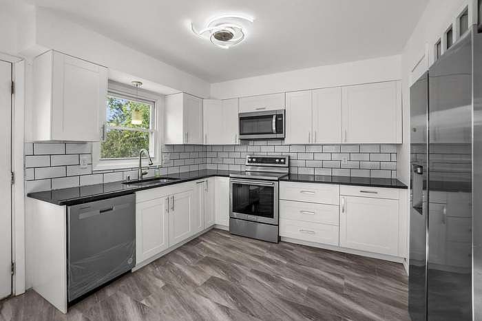 Your beautiful newly remodeled and spacious new home awaits! 3 bedrooms and 1.5 baths with a finished basement. Side-by-side townhouse with huge private fenced backyard. STUNNING kitchen with new stainless steel appliances including a dishwasher. New bathrooms, private washer and dryer in the basement, master bedroom balcony. Massive windows in the living room allows in ample sunlight. Central air (AC) and energy efficient windows throughout the house. Upstairs has three spacious bedrooms with generous closets and a large full bath. A garage parking space is included as well as driveway parking.