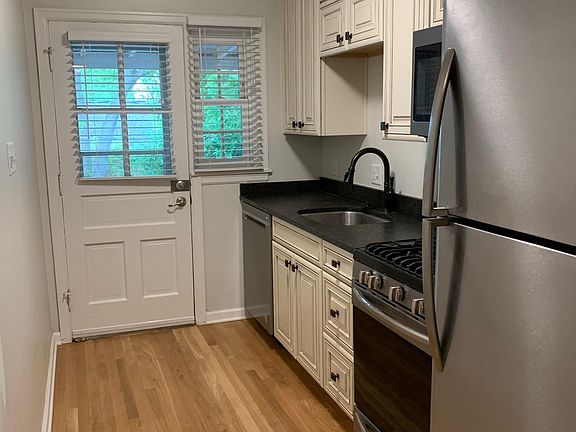 Remodeled 1 bedroom. Custom cabinets, granite countertops. stainless steel appliances. 5 burner gas stove, dishwasher, refrigerator, microwave. new a/c. Renovated bathroom. Black and white tile new bathtub, vanity. New hardwood floors. One car garage. Newer windows, with wooden blinds. Landlord pays for water, lawn care and snow removal. Tenant pays for gas, electric and cable. NO DOGS PLEASE. KITTIES OKAY. $1350per month with $1350 deposit. This is a privately owned and operated apartment. Thank you so much for your interest. No Dogs Please. Landlord pays water, lawn service, and snow removal. Tenant pays for gas, electric, and cable/wifi.