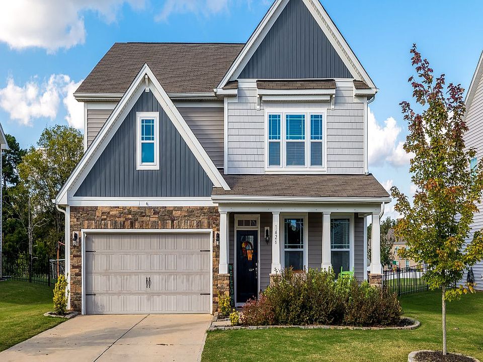 Don't miss this move in ready, Timberlake neighborhood home. The welcoming rocking chair front porch and pop of color siding showcase this home's beautiful curb appeal. The mouldings and hardwood floors throughout the open concept floor plan provides a great flow. The butler's pantry adjoins the dining room and who doesn't love a gourmet kitchen adorned with white cabinetry? A full bathroom and bedroom on the main floor. A full drop zone just outside of the garage complete with built in storage. Upstairs, enjoy a full loft with 3 BR upstairs. The oversized owner's suite has an ensuite spa-like bathroom with a large walk in closet. The backyard is flat and spacious with a fenced yard that adjoins the common area and access to the community pool. The community has trails and a pond.