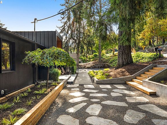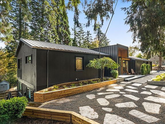 Modern contemporary design with exceptional architecture and stylish liveability that includes a private detached office/studio. The striking entry with cedar accents welcomes you to an open living area complemented by a wall of windows, fireplace, and built ins. Solid oak cabinets anchor the sleek kitchen featuring a spacious marble island with room for seating. Floating cabinets and shelves flank the 6-burner range with custom hood. Floor to ceiling windows and sliders connect you to the outdoors and open to an expansive deck and flat back yard. Wide plank hardwood floors and a myriad of designer touches. Main floor primary suite with luxurious master bath and walk-in closet. The lower level has 2 additional bedrooms, large family room with fireplace and built-in wet bar along with ample space for impromptu gatherings, crafts, hobbies and games. Beautifully landscaped backyard with a fire feature and a freestanding private office/studio matching the contemporary design elements of the home. Perfectly situated in the Uplands neighborhood and close to downtown Lake Oswego and award-winning schools. Plus, Uplands Lake Easement.