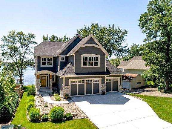 This walkout Two Story has amazing views and flat yard to enjoy all activities. Set perfectly to enjoy the views yet out of the traffic pattern for privacy and less shore disruption. Main level is open and bright with full lakeside windows. Great touches on the main level w/ arched openings and fireplace and a custom kitchen w/ commercial grade appliances and beverage station. Enjoy outdoor space from the generously sized maintenance free deck for more lake views. Incredible views in the Master suite, 3 more bedrooms up along w/ built-in workstations in hallway. Lower level includes gas fireplace, amusement area w/full bar and patio door access to the lower level deck & lakeshore. The ultimate in lake experience happen when home, lot, amenities, location, and storage come together!