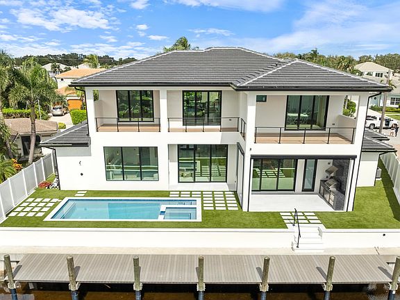 Your dream home on the water is here!! A rare opportunity for all new construction on the water in the heart of Palm Beach Gardens. This stunning 5 bedroom, 8 bathroom Smart home has all the upgrades and a modern open floor plan. The second floor has an open living space with water views and a wet bar that makes a great family room, and all the upstairs bedrooms have generous balconies for beautiful views and en suite bathrooms. This property has a 2022 65 ft dock and 2021 seawall, no fixed bridges and is seconds from the intracoastal waterway making it a boaters dream! The gorgeous modern pool features an integrated overflow spa and overlooks the waterway. A beautiful summer kitchen, a separate cabana bath and tumbled marble pavers complete your outdoor living paradise. The open kitchen boasts custom cabinetry, stainless steel Thermidor appliances, and Dolomite Quartzite counters with a huge island. This stunning home is on a quiet cul de sac with no HOA in the heart of highly desirable Palm Beach Gardens. It also boasts a 3 car garage, a whole house propane generator, a whole home Sonos sound system and full impact glass. Did I mention the 10 foot sliders and gorgeous water views throughout?! Peace and tranquility on the water in the heart of it all. Who says you cant have it all?