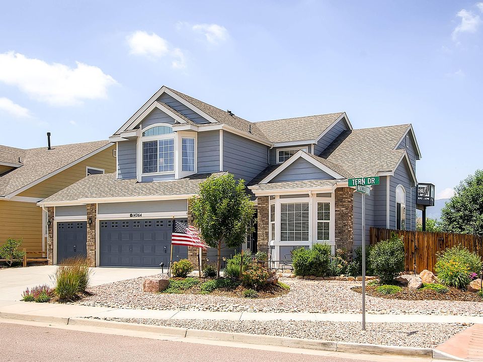 Beautiful 2-Story Home on a great corner lot boasting 4 Bedrooms, 3 ½ Bathrooms, Main Level Office, 3 Car Garage and over 3,700 Square Feet. This home features a great floor plan with an open entry area, hardwood floors, spacious formal living room open to the formal dining area. The perfectly appointed gourmet kitchen includes a center island, ample cabinet and counter space, work desk area and eating nook with walk out to the beautiful backyard. The main level also includes a large family room with cozy gas fireplace. Unwind in the spacious upper level master retreat with walk in closet and 5 piece bathroom. There are 3 spacious secondary bedrooms and 2 full bathrooms that complete the upper level. One of the secondary bedrooms walks out to a private deck with beautiful views. The unfinished basement is perfect for future expansion and includes rough-in for a bathroom. Enjoy the beautiful landscaping in the backyard that allows for privacy and provides areas to sit, relax and enjoy the pleasant Pikes Peak and Front Range views. This move in ready home also includes a dog run, automatic sprinkler system, speaker system to main rooms, central vacuum system, great location and so much more!