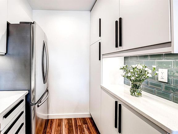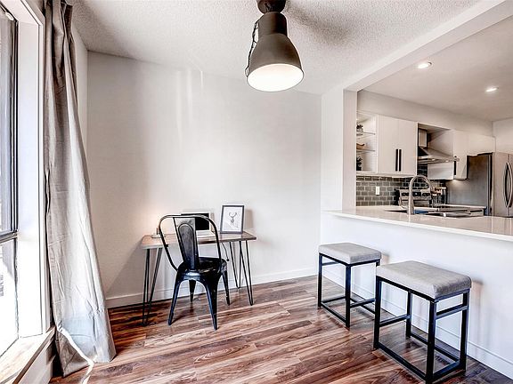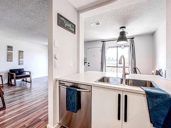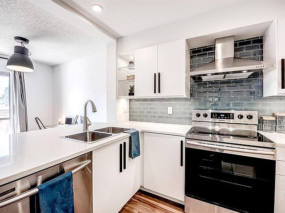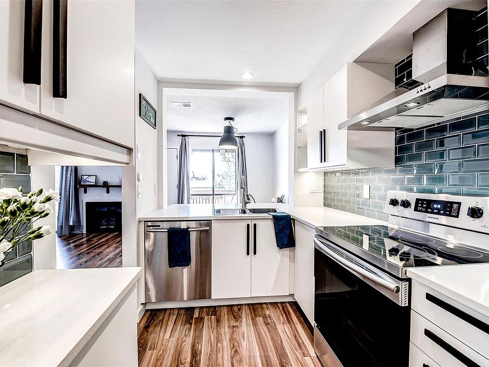 Magazine-worthy, high-end remodel done by professional interior designers! Walk-up style town home w/ large deck and 2-car garage. Brand new kitchen features latest design trends! Slab quartz counters, bar seating, stainless steel appliances, exhaust hood, white soft-close cabinetry, under cabinet lighting, glass tile backsplash, & new recessed lighting. Open concept living/dining room w/ gas fireplace & sliding doors leading to deck. Gorgeous laminate flooring runs throughout. Stunning full bathroom w/ black and white designer tile, new vanity, mirror, lighting, toilet, storage unit, and newly tiled shower. Master suite boasts a walk-in closet complete with extra shelving & a safe, plus dual sinks! Brand new washer/dryer w/ attached shelving & frosted door in laundry room. New window sills, paint, baseboards, lighting, & hardware. Conveniently located near dog park, public transit and I-225. Unit is right across the street from pool and grassy area w/ paved walking paths. ADT ready.