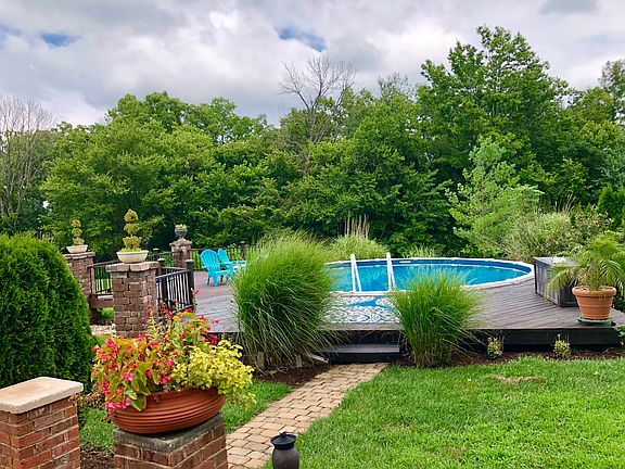 Beautiful brick-stone home sitting on 5 acres of land located close to 127. Has a detacted two car brick garage and a one car garage in the basement. 3 bedrooms and 2 1/2 baths, dinning room and breakfast nook, stone gas log fireplace, floor to ceiling windows with transoms, cathedral ceilings and hardwood floors throughout. Full finished basement with lots of extras.. Brick and stone accent walls, wood burning fireplace, built-in cherry/maple tv cabinet, laundry room, office area and plenty of extra space to use for another bedroom if needed. Outdoors has a nice wrap around front porch with brick columns, covered back porch area with a large uncovered patio, screened-in porch off the Master bedroom, 24ft pool with large deck and stone columns, gorgeous landscape with several mature trees and a chicken coop. Views are beautiful all the way around!