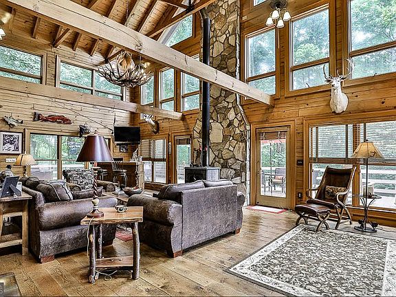NEW BEDROOM IN THE BASEMENT HAS BEEN ADDED! Whether you're looking for a profitable short-term rental or a mountain home that pays for itself, this 3-bed, 3-bath stunner on 2.75 private acres offers the best of both worlds and it's only 6 miles from Blue Ridge. The open-concept layout with 25-foot beamed ceilings and full-height windows gives the space a bright, airy feel, and the real rough sawn hardwood floors bring warmth and charm. With two septic systems already in place, you can rest easy knowing this home is equipped to handle the guest load, especially for the holidays. The fully remodeled kitchen makes entertaining easy, and outdoor living is dialed in with a huge open deck, screened-in porch, hot tub, and fire table-all surrounded by mountain views and total tree top privacy. Downstairs, the finished 1,637 sqft basement adds flexibility for guest space, storage, or a game room setup, and the fenced yard is ready for four-legged visitors. It's move-in ready, STR-ready, income ready and waiting for someone to make the most of it.