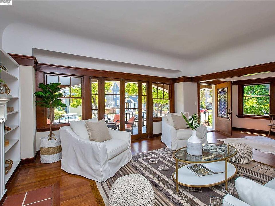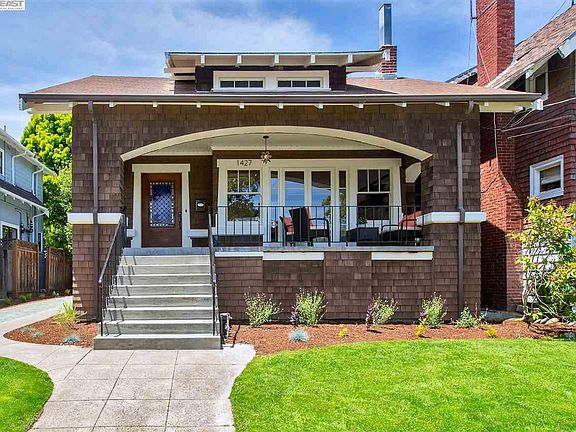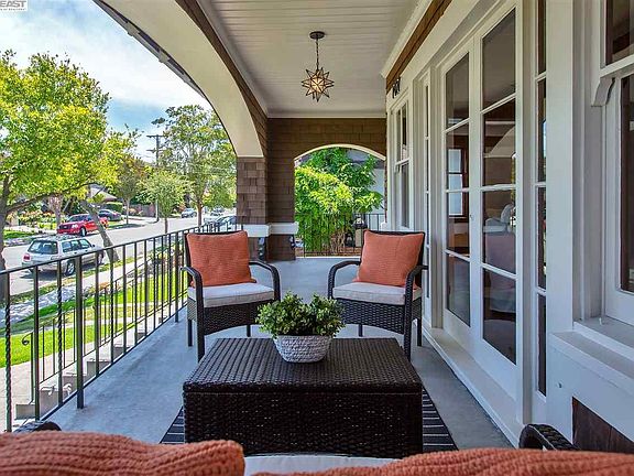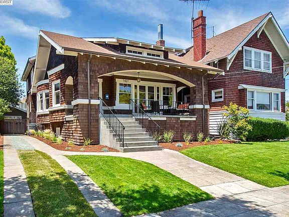Located in Alameda's sought-after East End neighborhood, this elegant 1912 brown shingle Craftsman is unusually large at almost 2500 SF. Wonderfully preserved with many beautiful original architectural details, this multi-level home offers a stunning living room and dining room, spacious kitchen, a partially finished 580 SF basement & a 324 SF home office/studio that's just steps from the house. Original features include refinished oak floors, picture rails, bay windows, 9-ft coved ceilings, 2 fireplaces & a stunning art glass front door. A huge MBR suite includes new carpeting, a 14-ft cathedral ceiling, multiple large closets & a divided en-suite bathroom. The finished home office/studio has recessed lighting, dual-pane windows & a terra cotta tile floor. Close to top performing Alameda schools, Lincoln Park, downtown Park St. & Encinal Market. Easy commuter options include the SF Ferry, BART, AC Transit O bus, Casual Carpool & Tech shuttles. Don't miss this incredible home!