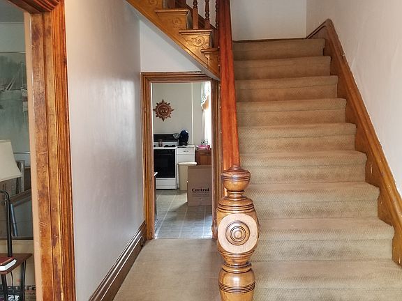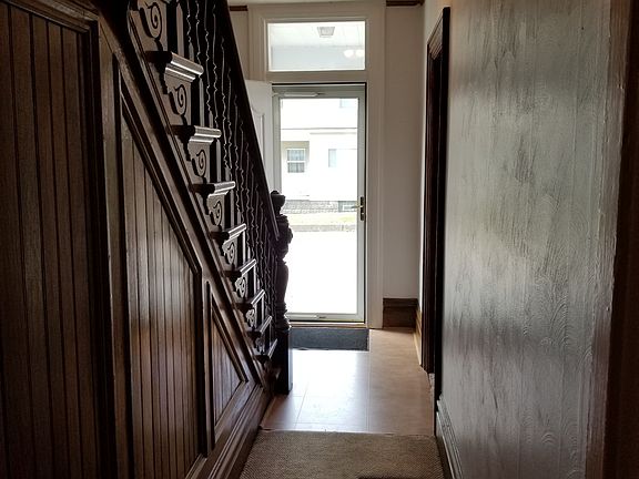 Nice two story home with large rooms ,decorative fireplaces and lots of original woodwork.Large eat in kitchen is next to large dining room allowing for flexible floor plans.Very decorative hand rail and spindles highlight natural wood staircase to 2nd floor.Newer bath serves 3 large bedrooms. The basement is full with a sink , shower and toilet.Back porch has a built in storage shed.Yard is fenced for kids and pets. Large 2 car garage in rear of property.