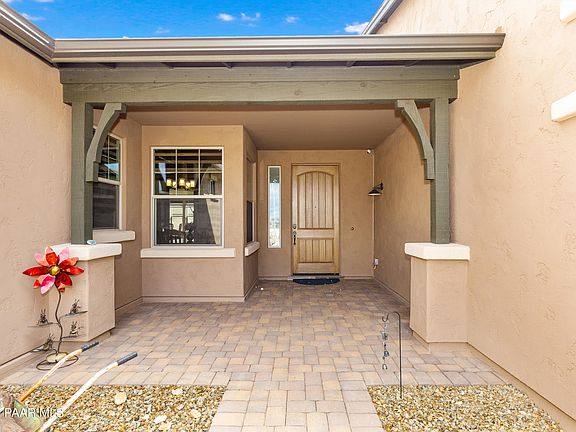 Beautiful home inside and out in Mollie Rae Estates. Be welcomed through the 8-foot front door into a foyer with gorgeous floor tiles and sightlines throughout the living space, dining areas, and upgraded kitchen with many chef qualities and beautiful cabinetry. The split floor plan with its flex room avails much privacy. The windows and doors will draw your eyes to the outside patios, gardens, and views of Granite Mountain and Mingus Mountain. Mollie Rae Estates allows for RV parking and this has double gate access to an RV pad with hookups. And don't miss the workshop and car/boat storage shed, both at 12x32 in size. There are so many upgrades inside and outside of this home, it will not disappoint.