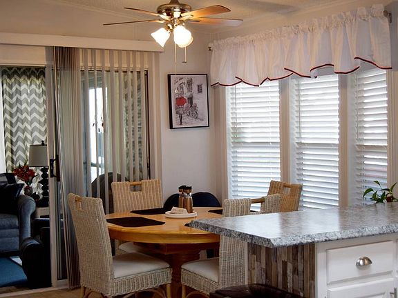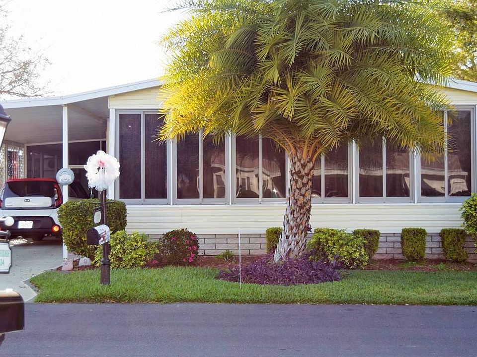 Homes in the Four Lakes Golf Community are on lot leased land. Owning the home, but not the land, you pay a monthly lot rent of $541.00 which gives you and your guest access to the amenities of the community............. This beautiful split plan home has two bedrooms and two baths. The main bedroom is very large...lots of room for a king bed and larger dressers. The en suite bathroom has two sinks. Not just any sink, but beautiful colored, free standing bowls with gorgeous faucets. The guest bathroom also has the same treatment to catch your eye. The guest bedroom is spacious, as well, and both bedrooms have great closets............. The front room and dining room are a great size to entertain all your new friends in comfort. The kitchen in this home boasts many updates done in 2019: New cupboards and countertops with beveled edges. The wall treatment is eye appealing. Everything here is top notch and just gleams. The appliances are white............. The lanai is on the front of this home offering you another 200 sq. ft. of living space. This room has new glass windows and screens. There is an air conditioner with heat built in for your comfort............. An extra screened porch is on the side of the home. The shed is extra wide and has room for the washer and dryer, a fridge and work areas. The roof was just done last week and the AC will be new soon............. Your worries are all taken care of. Come take a look!