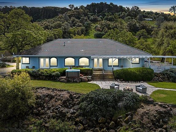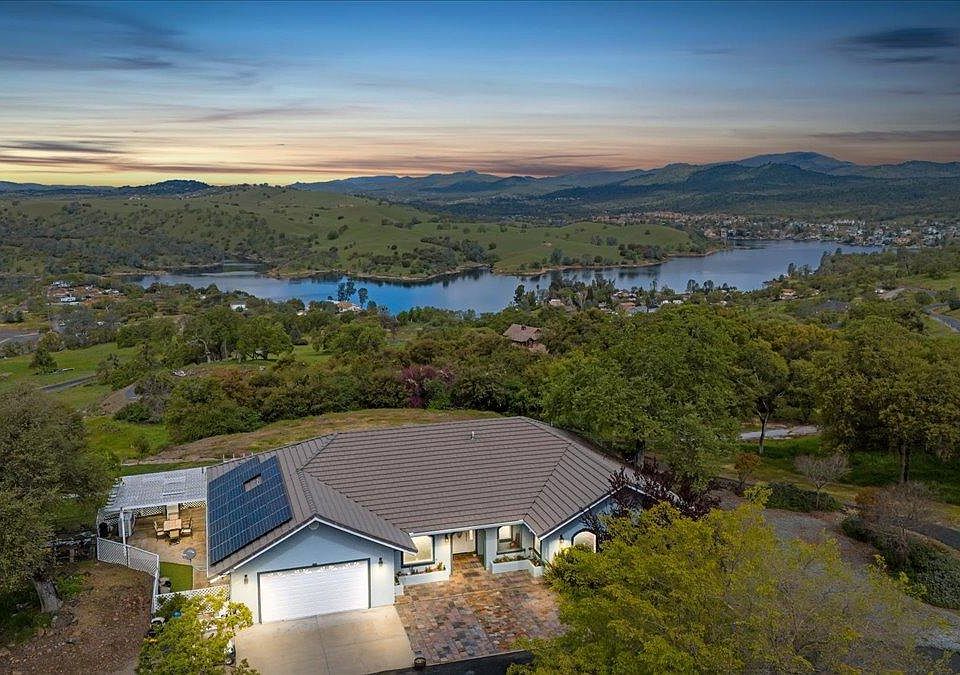 Welcome to your unparalleled lakefront oasis & countryside retreat, spanning nearly 9 picturesque acres! Nestled within exclusive Black Jack Bluffs acreage Estates, this custom-crafted estate promises tranquility & seclusion. The joys of lakeside living await w/your very own deeded boat slip, community launch, beach access, picnic gazebo & park along the shores of Lake Tulloch. As you pass through the private gates, a circular drive, bordered by majestic oaks, sets the stage for all that awaits. This custom-designed, single-level ranch home boasts a lifetime tile roof & a freshly painted exterior. The property offers an attached 2-car garage + a detached 3-car garage, providing storage for vehicles, watercraft & recreational gear! Step inside to discover a bright & inviting interior adorned w/slate tile accents. Your gaze will be drawn towards a sweeping panorama of Lake Tulloch through a magnificent array of arched windows & French doors. Whether you're seeking a peaceful retreat to work from home (great high-speed internet available!) or a 4th bedroom for guests, the expansive office, complete with mesmerizing bluff views, offers versatility. The heart of the home unfolds seamlessly with a spacious living room adorned with a slate-tiled propane fireplace & built-ins, flowing effortlessly into a generous dining area illuminated by natural light cascading through French doors. Outside, a sprawling rear patio invites you to unwind to lake breezes or a soak in the hot tub. Additional covered patio & deck areas provide idyllic settings for entertaining against a breathtaking backdrop. The gourmet kitchen is a culinary enthusiast's delight, boasting gleaming granite-slab countertops, slate-tile backsplash, s.s. appliances, a sizable island & an abundance of cabinet space, including a large pantry. Adjacent, a light-filled laundry rm is equipped w/ample storage + a washer & dryer. Embracing modern sustainability, a solar system & a fully-owned backup power wall ensure uninterrupted power. Dual-paned windows, central heat & air + an attic fan, guarantee year-round comfort & efficiency. Retreat to the expansive owner's suite, where French doors open to the patio. The lavish en-suite bath is complete w/jetted tub, generous shower, vanity & an immense walk-in closet. Outside, the possibilities are endless! Vast expanses of level, usable land & additional flat areas are ideal for future expansion or a 2nd residence. With 2 wells + a septic system, monthly expenses are kept to a minimum, affording you the freedom to revel in outdoor pursuits, cultivate gardens, raise animals, or embrace a myriad of hobbies. Experience the epitome of lakefront living & countryside charm, coupled with the convenience of a private location, just mins from HWY 108 for effortless commuting up the hill or to the valley & a mere 2 hours from the bustling Bay Area. Don't miss this rare opportunity to own one of the most coveted, usable, level acreage estates in Black Jack Bluffs!