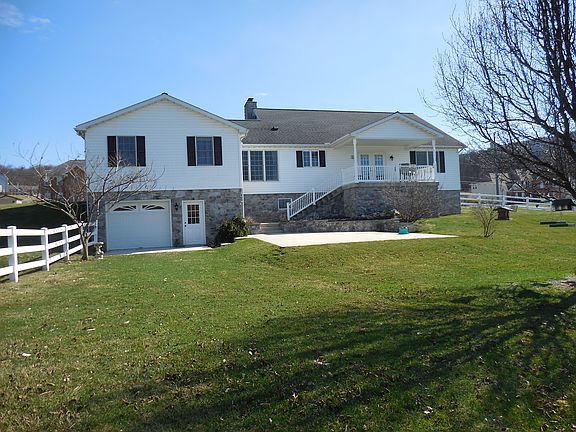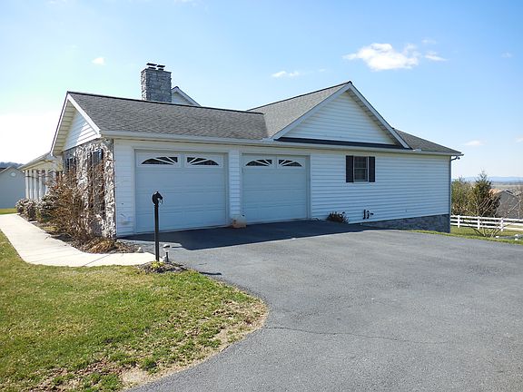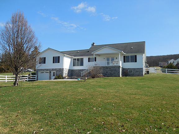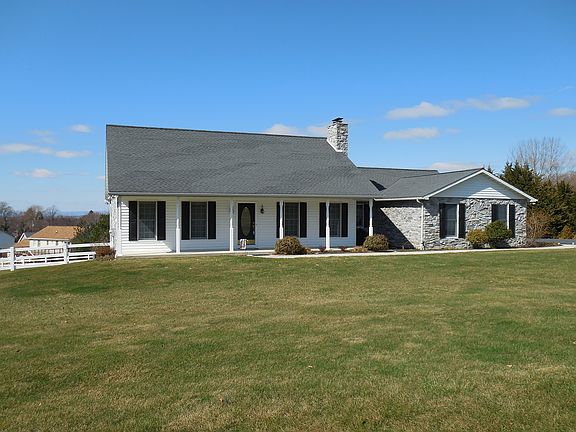Custom built ranch style home overlooking the valley! HW and ceramic tile throughout. Master suite with large walk in closet with built ins. Whirlpool in master bath. Living room with vaulted ceiling and wood burning fireplace. 1st floor laundry room and large pantry. Fully finished basement leads to additional garage including paint booth & workshop. Fenced backyard. 1 yr. home warranty. VIEWS!