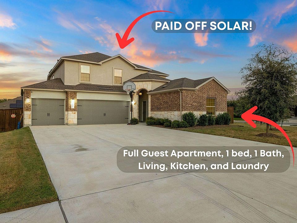 SEE VIDEO TOUR linked or google the address! Full 1 bed 1 bath guest apartment with full kitchen and laundry, on top of a gorgeous 4 bedroom, 3 bath plus loft home, with PAID OFF SOLAR, an air-conditioned and finished 3 car garage, full width driveway, set up for a natural gas backup generator AND battery backup, and so much more! All under 1 roof, this home offers something that almost nothing else similar has, with a corner lot just 2 minutes driving to Old Settlers Park, featuring 3131 total square feet, this 2020 built NextGen home features: a 4 bed 2.5 bath “main home” that has a downstairs primary with huge closet and tub and shower in the primary bath, downstairs guest half-bath, and upstairs 3 more bedrooms with large closets and a huge game loft. The guest apartment its connected with a door to the main home, but can be closed off for total privacy. The guest apartment has its own front door, back door, full kitchen, full bath with walk in shower, laundry closet, and full bedroom; paid off 10.95kw solar system, enough to nearly cover the entire electric bill installed in 2024, a whole home water softener and RO drinking water tap, finished 3 car garage that’s air conditioned and a professionally installed epoxy flooring and car charging outlet, prewired for an Ecoflow battery backup system (negotiable with the house), whole home backup natural gas generator wiring and plumbing (generator negotiable), Old Settlers Park with the shortly opening amphitheater, newly remodeled water park, and so so much more, in addition to HEB Plus, Walmart, historic Round Rock Main Street with phenomenal restaurants and one of the most desired lifestyles of all suburbs of Austin. This is the opportunity you’ve been waiting for.