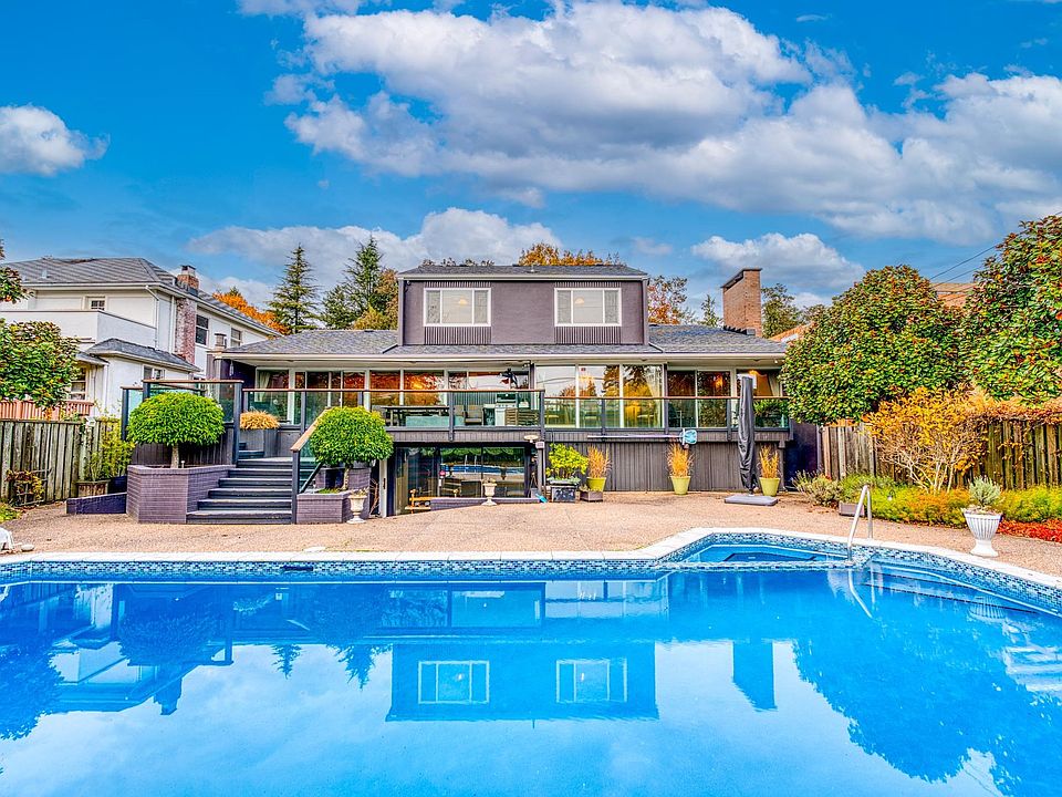Located in Vancouver’s prestigious Shaughnessy neighborhood, this 6-bed, 4-bath residence combines classic charm with modern comfort. A grand foyer with vaulted ceilings and crystal chandeliers opens to elegant living spaces designed for both family life and entertaining. Enjoy a large recreation room with a bar and seamless flow to over 2,100 sq ft of outdoor living. Complete with a sun-filled deck, patio, and a well maintained and upgraded heated swimming pool.The primary bedroom is conveniently on the main level, and the home has been upgraded with a Level 2 EV charger. Just steps from VanDusen Garden and Vancouver College, with quick access to prestigious private schools-Crofton House (10 min), St. George’s (12 min), and West Point Grey Academy (14 min)