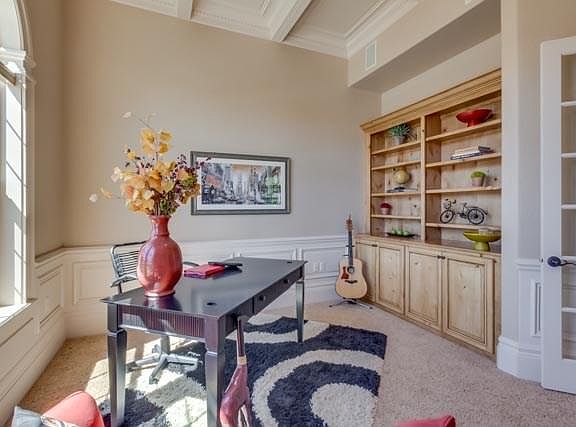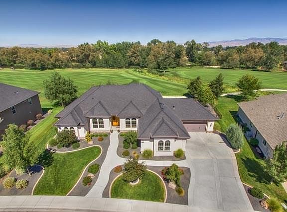 Rich design work draws you in with intricate ceilings and custom trim. Gorgeous stone and tile work throughout is accented by beautiful maple flooring. Gourmet kitchen is complete with high-end appliances, beautiful cabinetry and slab granite countertops. Abundant windows throughout the home offer enjoyment of a picturesque view from all angles. Incredible master suite provides a private oasis in your own home. Unique 4-car garage is more than ideal with mass amounts of storage and epoxy flooring. North-facing lot has much to offer; backing directly to the golf course with a short walk to the river front.