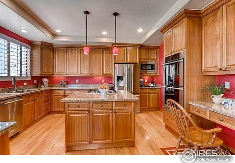 This gorgeous Huntington Trails home has it all. Four master suites upstairs plus an additional main floor guest suite with an attached bathroom. Kitchen features 42” custom cherry cabinets, stainless steel appliances, granite countertops, wood floors, new Electrolux double ovens, built-in microwave, newer dishwasher, newer disposal and four burner gas cooktop. The kitchen flows nicely into the great room with vaulted ceilings and custom built-ins surrounding the fireplace. All of the bathrooms have been upgraded with granite, cherry cabinets and tile or wood flooring. The retreat-like master suite includes a fireplace, sitting area, five-piece luxury bathroom with granite, dual vanities and an oversized master closet for your entire wardrobe and more! The basement was professionally finished with recessed lighting, tray ceiling, media space, built-in cabinets and a spacious craft room – plus there’s a huge unfinished space for all your storage needs. The oversized main level custom powder room has marble countertops and wood floors. Enjoy the amazing weather Colorado has to offer with an outdoor eating space on the stained custom patio out back. The laundry room includes an abundance of cabinets, laundry sink, tile floors and granite counters. Other upgrades include solid wood doors, plantation shutters throughout, wrought iron staircase railings, dual-zone heating system, nine-foot ceilings in the basement and newer A/C unit upstairs. Only steps to McKay Lake with lots of trails. Enjoy all that the HOA has to offer, including a pool and clubhouse!