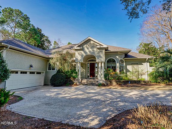 Quaint Creekside home nestled on a very private 1.2 acre lot surrounded by mature trees and offering lovely views of Futch Creek. Features include a single level floor plan with spacious owner's suite, elevated pool deck overlooking the backyard and a private pier with floating bock dock. Recent upgrades include a new fortified roof installed in 2023 and new HVAC unit in 2021. Large kitchen with butcher block island, adjoining family room with stacked stone gas fireplace, wet bar and adjacent screen porch. High ceilings, new sky lights and numerous large windows provide an abundance of natural light. This home offers exceptional privacy in a very natural setting with resident herons, egrets and osprey gliding above the tranquil waters of Futch Creek. A neighborhood boat ramp is just minutes away.