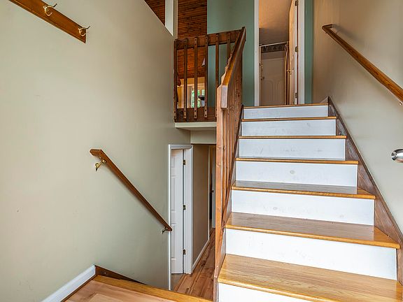 Spectacular townhome in Hartland Woods subdivision offering 2 bedrooms and 2 full baths! Split foyer with inviting hardwood stairs going to upper and lower level. Upstairs has vaulted great room with cathedral wood ceiling and beautiful laminate flooring throughout the living space. Great room opens to kitchen with full complement of appliances and dining area with newer sliding glass door goes out to brand new deck. Plus, full bath with tile flooring and shower stall complete the first floor. Downstairs has 2 bedrooms, full bath with tile flooring and tub/shower combination, utility closet with washer and dryer. Primary bedroom features new carpet and walk- in closet. Per owner new HVAC installed 9/2024. Per HOA all townhome roofs have been replaced in the Summer of 2024. Don't miss out on this unique opportunity as this townhome offers 2 full baths. Each unit has 2 designated parking spaces as well as off street parking.