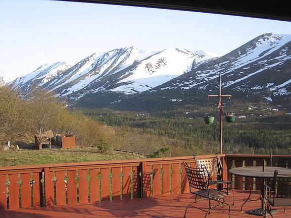 Rare opportunity to live the Alaskan Dream. Nearly 5 acres of land backing to Chugach State Park. Plenty of sunlight—home faces south and west in Hiland Valley. Quality construction. Very clean , very bright and very roomy three bedroom home is ready to move in. Updated throughout: new SS fridge, SS stove, SS microwave. New metal roof in 2006. Kitchen remodeled in 2007. Updated lighting throughout home. 5” hickory hard wood flooring on main level and solid bamboo flooring upstairs. Custom Stainless columns in kitchen. Custom crafted banister designed and built by local metal artist. Two bedrooms on main floor and huge master bedroom and office space upstairs. New Big windows bring in the splendor of Southfork. Huge deck (1000+ SF) for summer BBQs. Great light throughout the entire house. 1900 square feet. of open floor plan. 25 foot cathedral ceilings with exposed beams. Tongue and groove ceilings. 3 bedrooms . 2 Bathrooms . Awesome free standing wood stove. New Metal Roof October 2006. New Interior Paint. Nearly 5 acres of land—backs to Chugach State Park. One minute from South Fork Trailhead. 5” Hickory hardwood flooring. Bamboo flooring upstairs. Huge Master bedroom. Nice office space upstairs (loft). Two outbuildings for storage. Covered decking on north and east sides of house. Shown by appointment only. Call 907-622-4058