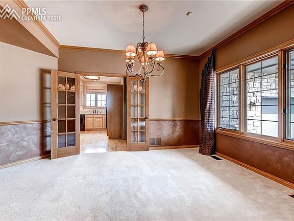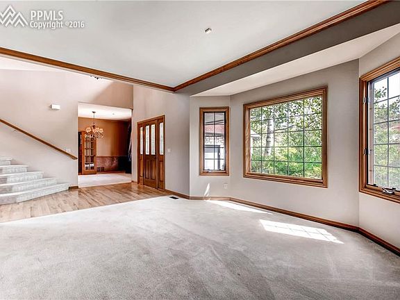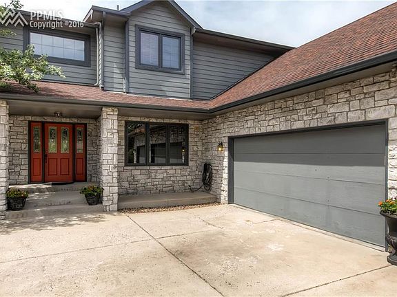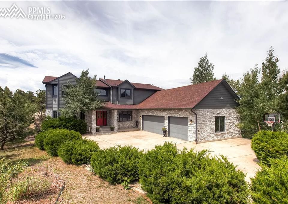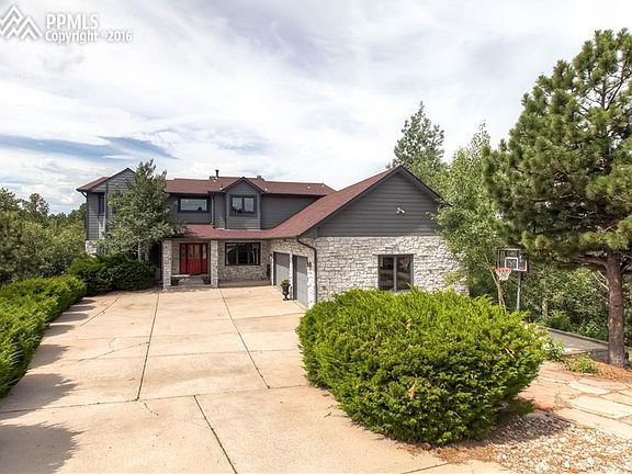 Beautiful custom two story with beautiful views located in sought after Woodmoor. Charming covered front porch opens to a cheerful hardwood foyer that leads through French door to the formal dining or the living room with a large bay window and crown molding. It also leads into a spacious great room with soaring ceilings, stunning floor to ceiling stacked stone fireplace & a wet bar. Gourmet kitchen features granite counters with a counter bar, gas cooktop, double oven, large walk-in pantry and a breakfast nook that walks out to the large deck; ideal for entertaining. Upper level features a spacious master suite with stacked stone fireplace and walk-out to a private balcony with stunning mountain views. Adjoining five piece master bath and large walk-in closet, two secondary bedrooms connected by a full bath complete the upper level. The walk-out lower level has an two additional bedrooms, a full bath and a large rec room that walks out to a covered patio. Central vac, plantations shutters, security system, humidifier, multiple outdoor living spaces, a flagstone walk and so much more. A must see!