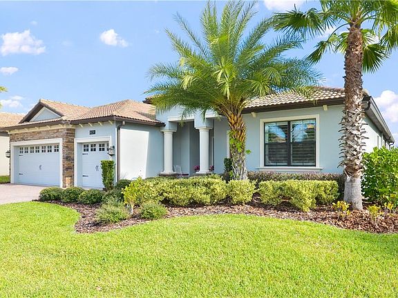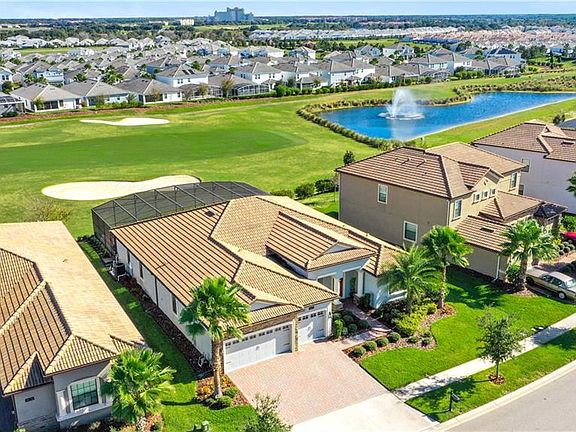 This immaculate, light-filled home located in The Estates at ChampionsGate features a spectacular panoramic golf-front and water view. Overlooking the 16th hole of the ChampionsGate Country Club course, this sprawling, single level home boasts 2,951 square feet of luxury living. Upgrades completed after the original build are numerous but include a luxurious private screened and paved patio with a magnificent saltwater pool and spa. This beautiful residence also features 4 luxurious bedrooms, 3 bathrooms, and an expansive 3-car garage. An additional office could easily be considered a 5th bedroom. Additional upgrades include modern 18"x12" ceramic tile throughout, plantation shutters, elegant pro-designed master closet with built-in cabinetry, modern pin lighting, upgraded landscaping, electronic dog fence and gutters. The modern kitchen features granite counters and stainless steel appliances. Residents of the Estates at ChampionsGate can enjoy luxury-inspired golf course living with access to all courses and bundled unlimited golf included. Residents of The Estates have access to the state-of-the-art, luxury-inspired Oasis Club at ChampionsGate. This exclusive clubhouse features a resort-style swimming pool with a lazy river and splash pad, a fully-equipped fitness center, an arcade, a tiki bar, a theatre room, a restaurant and bar and so much more. In addition, residents now enjoy exclusive access to The Plaza, a private residents-only amenity center for ChampionsGate. Whether you are visiting the club for private dining, a casual lunch with friends, or refreshments at the bar, residents can always expect genuine and caring service. Other amenities include 6 lighted tennis courts and a tennis clubhouse with a volleyball court and pickleball complex. HOA fee also includes basic cable, telephone, high-speed internet, lawn maintenance, security & guard-gated entry. The close proximity to I-4 puts this community right near all the action of Orlando, including the numerous theme parks and attractions, shopping, dining and nightlife.