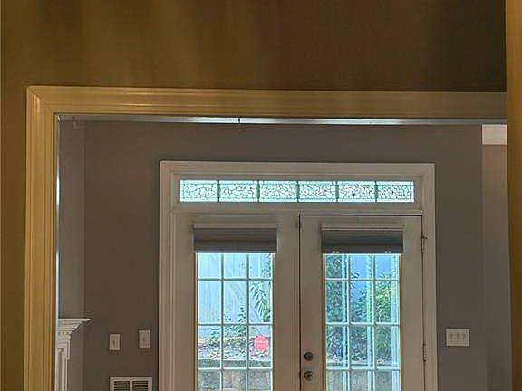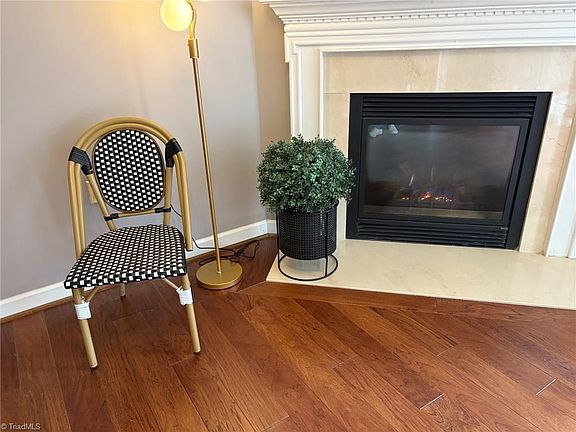 Inviting home with a bright great room featuring a corner fireplace and wood floors. Open kitchen with granite counters, breakfast bar, shaker cabinets with lighting, pantry, and Bosch dishwasher (2023). Hand-crafted stained-glass accents in foyer and transoms add charm. Primary suite offers walk-in shower and double-sink vanity. HVAC replaced 2023. Enjoy a private fenced stone patio with lovely landscaping. Attached garage includes shelving and workbenches—great for storage or projects.