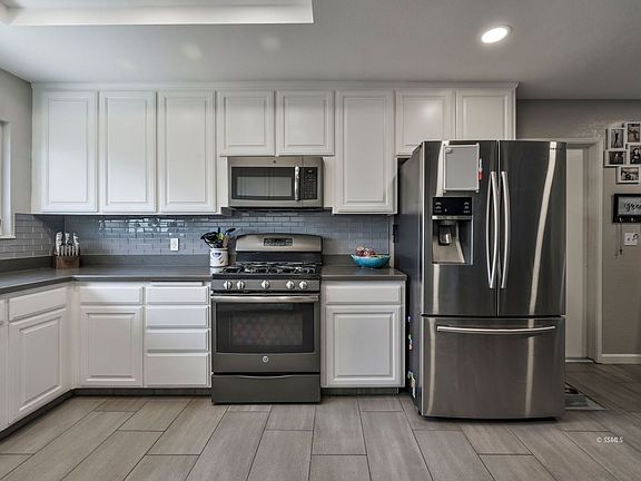 All dolled up 3 bedroom, 2 bath home with PAID solar. Tile floors leading to open kitchen area with new cabinets, sold surface counters and stainless steel appliances. Large living room with recessed lighting and carpet. Primary bedroom has French doors leading to back yard and remodeled bathroom with new vanity, tile and shower. Guest bathroom has been updated as well - new vanity, bathtub and tile surround. Good size covered patio and storage shed. Dual Cooling! All of this with paid solar.