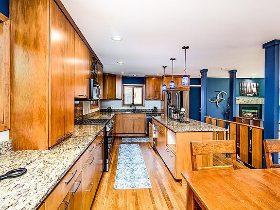 Brick Walkout Rambler with 5 bedrooms, 3 bathrooms, and over 2,500 sq ft of living space. The open floor plan seamlessly blends a full gourmet kitchen, a spacious dining area, and a cozy living room, centered around a stunning staircase with a unique mid-century modern railing. Enjoy picturesque views of the park-like wooded yard from the living room’s picture window while relaxing in front of the gas fireplace. The chef’s kitchen, featuring granite countertops, an oversized island, and stainless-steel appliances, is designed for culinary creativity and entertaining. The spacious main full bath features 1950s charm, complete with retro tile. Enjoy grilling on the back patio from the cozy 4-season porch that has its own gas fireplace. The three main-floor bedrooms include a primary bedroom that boasts a private ¾ bath. The walkout basement is flooded with natural light. The two lower-level bedrooms feature lookout windows that overlook the beautiful gardens. the large lower-level family room is anchored by a full brick wall with a gas fireplace and offers space for relaxing or gaming by the fireplace, as well as room for a game table or craft area near the sliding door. The kitchenette includes a refrigerator, dishwasher, sink, cabinetry, and a bar with stools. The bright and airy laundry and utility room features abundant storage. The three fireplaces add cozy ambiance throughout the home. This urban retreat is situated in the heart of nature. This stylish walk-out rambler with mid-century modern touches is surrounded by three outdoor patios, mature perennial gardens, and mature trees in a quiet neighborhood with tree-lined streets close to Tony Schmidt Park trails, Lake Johanna, and within the highly rated Mounds View School District.