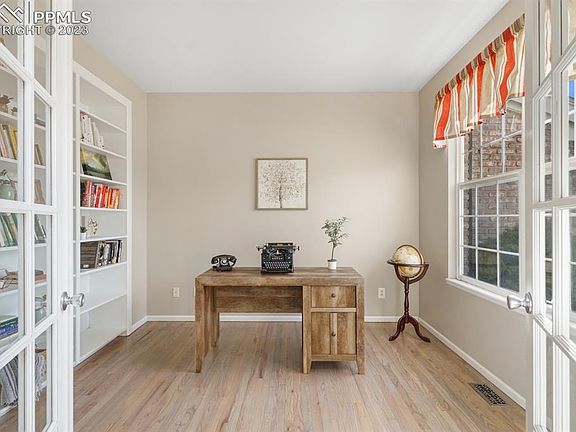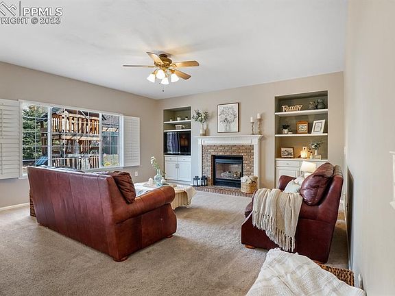 This beautiful two-story home located in Colorado Springs' D20 School District is nestled on a large Cul-de-Sac lot and is conveniently located near the United States Air Force Academy and I-25 corridor. It boasts five bedrooms, four bathrooms, and a myriad of stunningly updated amenities throughout. The formal living room greets you with warmth, complemented by the formal dining room which has easy access to the kitchen. The office offers a place for focus with French doors and built-in bookshelves, while the chef's kitchen is a focal point with an impressive center island, double ovens, gas down draft range, pantry, planning desk, granite counters, and 42" upper cabinets. Also on the main level, the family room is a haven for relaxation with a cozy fireplace, plantation shutters, and built-ins. The upper level bedrooms share a full bath and are in convenient proximity to the laundry room. The luxurious master bedroom has a spa-like adjoining 5pc bath, walk-in closet, and Pikes Peak views. The basement level offers an abundance of space for entertainment, with a large recreation room featuring a wet bar. Down here you will also find another bedroom and bath for guests. Other amenities of this home are a roomy 2-car garage, central air, 6’ privacy fencing around the large back yard, storage sheds for yard equipment, new water heater, 2017 furnace, and much more! This home has it all!