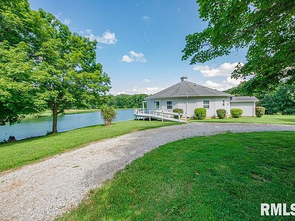 PRIVATE 53 Acres, a rare opportunity to own a Custom built home, Step inside to see Panoramic views of the water, land and wildlife and each season of the year, Open floor plan feels spacious and is full of natural light, per assessor, this home has 1558 square feet of living space, 2 bedrooms, 2 full bathrooms, move in ready, vaulted ceilings, original Hardwood Floors & Kitchen Cabinets hand crafted from the oak timber on site, step right out your door to fish, hunt or relax and enjoy the views of your own private oasis. The land is a mix of timber and open ground, currently in hay production, room dimensions are approximate, due to the curvature of the outer walls, this is MUST SEE property, pictures and words cannot do it justice, Field Grade School, Mt Vernon High School, and is located near Miller and Jaycee Lakes